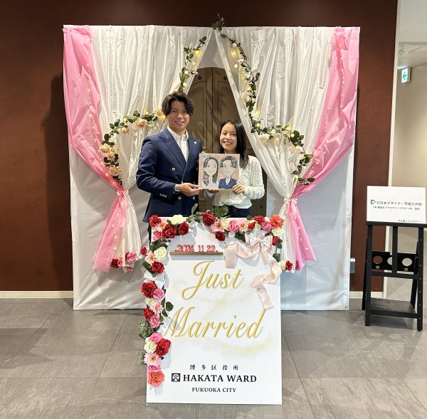 11月22日はいい夫婦の日ということで博多区役所にて婚姻届を提出された方を対象に「専門学校福岡デザイナー・アカデミー」イラストレーション学科の学生が似顔絵をプレゼントしました!