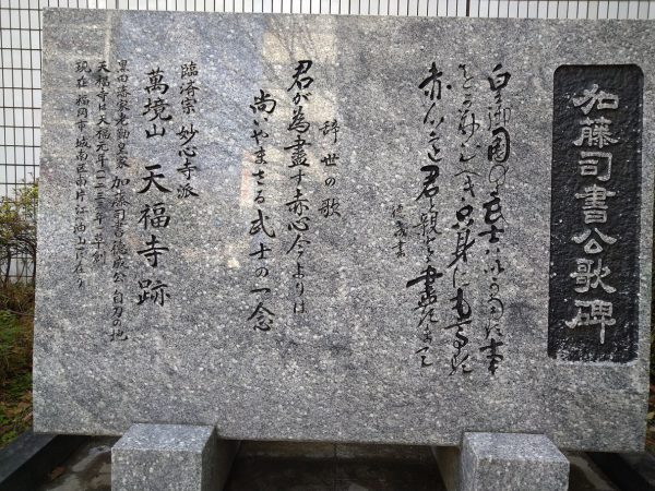 現在福岡祇園第一生命ビルディングの一角に、乙丑の変で、天福寺で切腹した加藤司書公の歌碑と城南区へ移転した天福寺の石碑が鎮座している。(明治の博多記より)