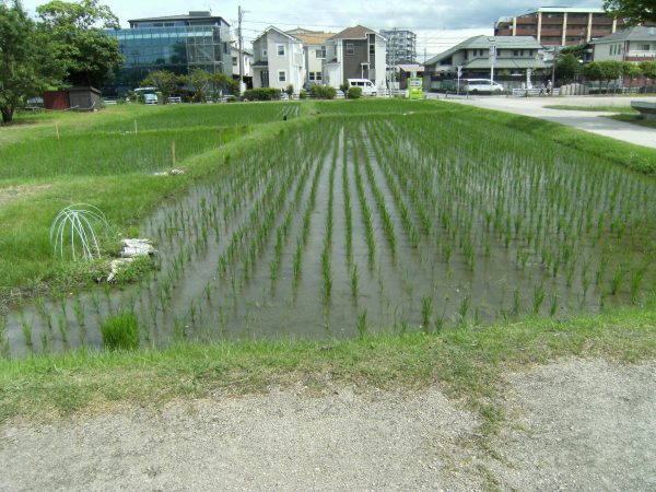 これが大博通りの「歴史の散歩道」の那珂久平遺跡の水田と足跡です。