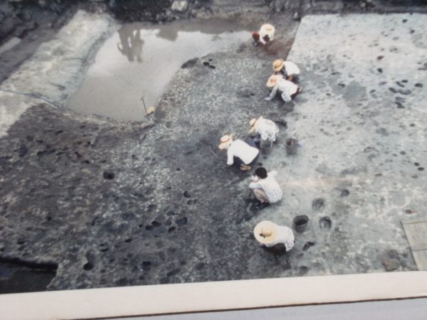 博多のメインストリートである大博通りの「歴史の散歩道」に【稲作文化の原点・水田と足跡(スタートから3番目のポイント)】の展示があります。ここに展示してある遺跡は那珂久平遺跡の写真です。水田の中におびただしい数の弥生人の足跡がありますが、残念なことに足の形とか大きさを知る事は、調査が終了し、埋め戻されているため確認はできませんでした。
