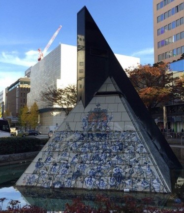 さて、筑紫口にあった、西島伊三雄さんが手がけたピラミッド型のモニュメント、覚えていますか?全4面に博多祇園山笠や博多松囃子が有田焼の陶板に直筆で描かれたものでした。