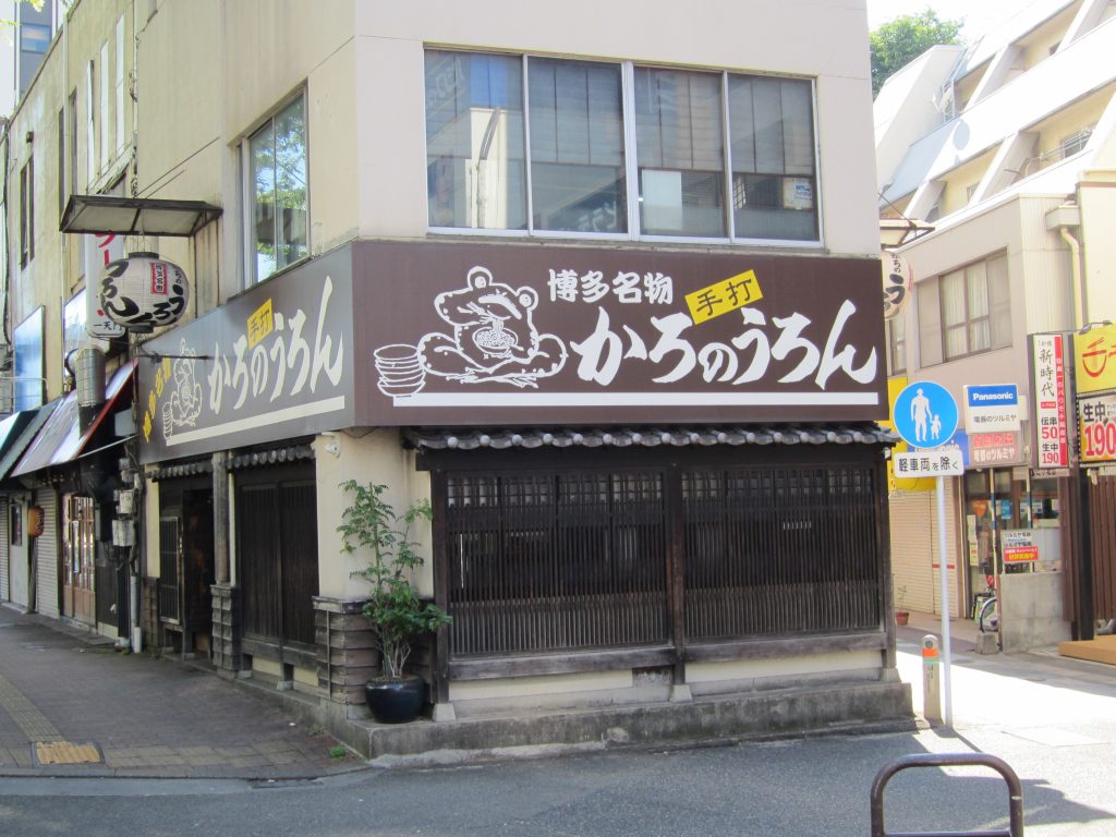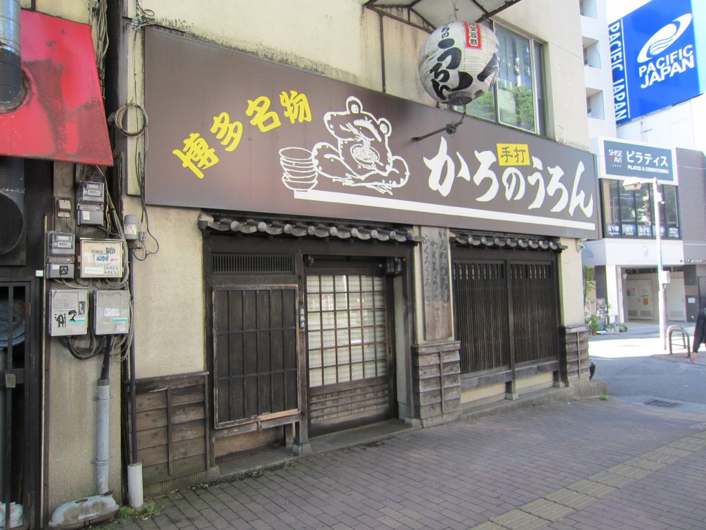 博多旧市街地の承天寺の庫裡(くり)に饂飩蕎麦(うどんそば)発祥の地の碑がある。うどんのおいしい店をよく聞かれるが、うどんの好みがあるので、ここの店が良いと勧めることは難しい。博多区祇園のキャナルシティバス停前「かろのうろん」という店がある。この店の前には観光客らしき人が並んでいる。博多のうどん店のレジェンドである。この店について、博多ガイドの会が以前企画したコースで紹介した時の文章を資料の中に見つけたのでご紹介したい。