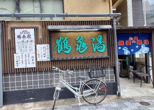 場所は住吉神社西門前の天竜池のすぐ先に昔ながらの「ゆ」の看板が見えます。鶴亀湯という煙突のある建物で、懐かしいようなレトロ感のある銭湯です。