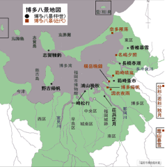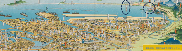 下地図の福岡市全景には、リンドバーク夫妻が旅行途中に水上機を操縦し来訪した名島水上飛行場(宿泊は共進亭ホテル)、出来たばかりの奈多の国際飛行場も描かれています。そして昭和19年には席田飛行場(現福岡空港)が建設開始、そろそろ博多の町にも軍靴の響きが聞こえてきます。