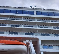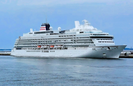 あいにくの曇り空ですが、真新しい白い船体がとてもきれいです。日本船籍のクルーズ船としては最大級で、近くで見ると圧巻です。タラップが格納されて、いよいよ出航準備が整ったようです。