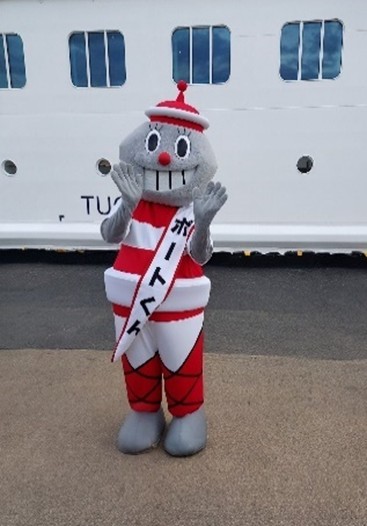 私達約100名と博多ポートタワーマスコットのポートくん、福岡市消防音楽隊の演奏、カラーガード隊のパフォーマンスとともに賑やかにお見送りです。手を振ると、乗客の方々(大きな手?)もデッキから振り返してくれました。やがて飛鳥Ⅲは優雅に岸壁から離れ、汽笛を鳴らして出航していきました。