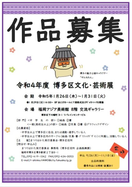令和4年度 博多区文化・芸術展 作品募集中♪ 11月18日(金)まで中学生以上で博多区に在住、または通勤・通学している人 または、中学生以上で博多区内のサークルに所属し、活動している人を対象に絵画・写真・書・グラフィックデザインの作品を募集しています!(写真・グラフィックデザインは高校生以上のみの募集) ご応募いただいた作品は、アジア美術館に展示予定です😊 詳しくは、こちらをご覧ください♪