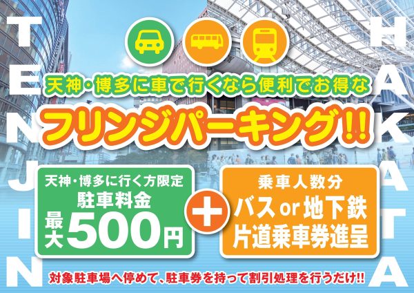 🚗フリンジパーキングについてのお知らせ🚗 これまで利用特典としてバス片道乗車券を進呈していましたが、10月2日(月)より地下鉄片道乗車券も選択できるようになりました! 天神・博多へ車でお越しの際は、フリンジパーキングをぜひご利用ください! くわしくはこちらをご確認ください。