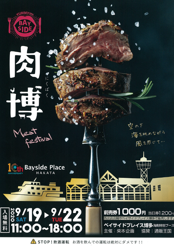 ベイサイドプレイス博多では,9/19(土)~9/22(火)の4日間,海側イベントスペースにて「肉博 NIKUPAKU 2020」が開催されます。