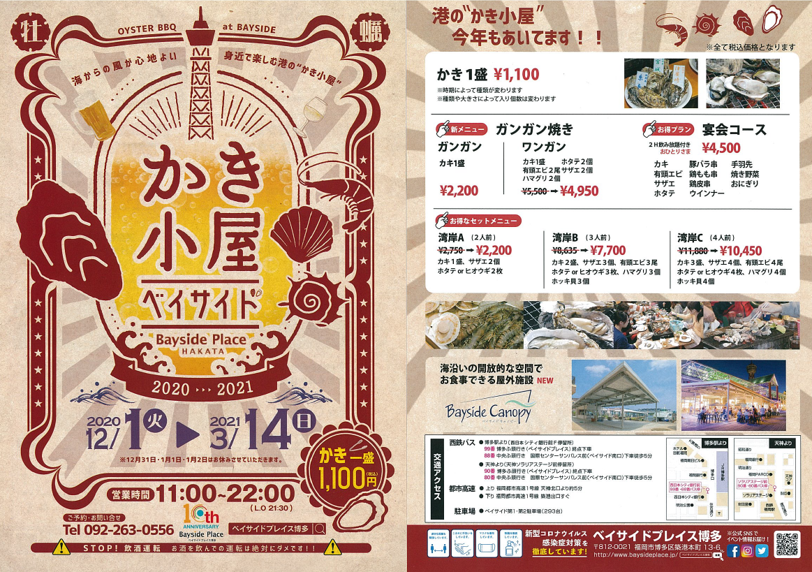 12/1(火)~3/14(日)の期間、ベイサイドプレイス博多にて「かき小屋ベイサイド」が開催されます!