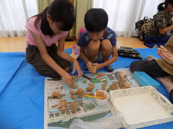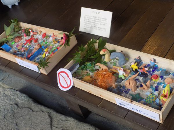粘土で人形づくりから、焼きあがったものに絵付け後、箱庭に飾り付け、いけどうろうを作ります。