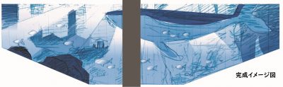 壁面いっぱいに、躍動感あふれる「クジラ」が描かれます🐋