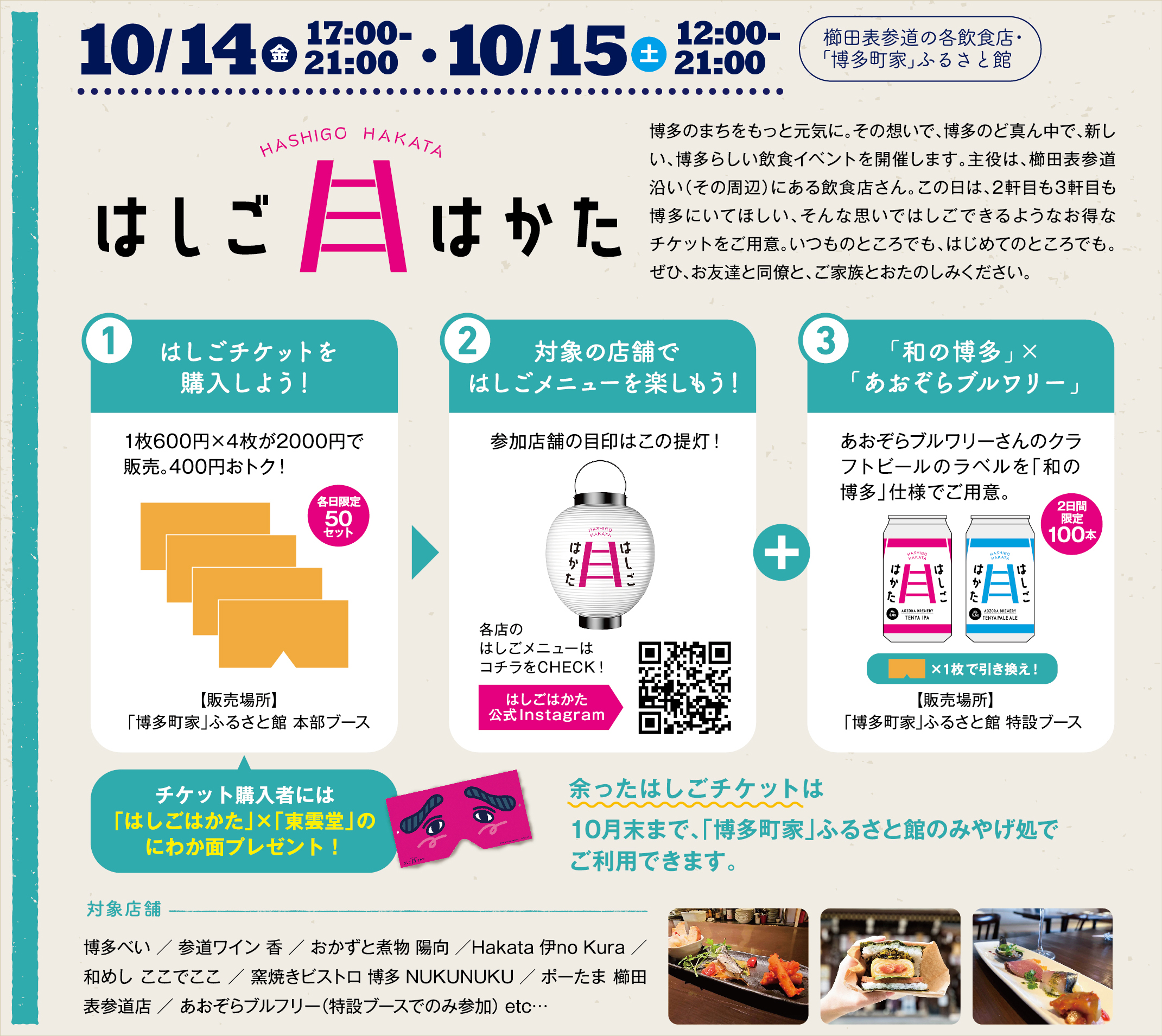 10月14日(金)、15日(土)の期間、櫛田表参道の周辺にある対象の飲食店で、はしごメニューを楽しめる「はしごはかた」を開催します♪
