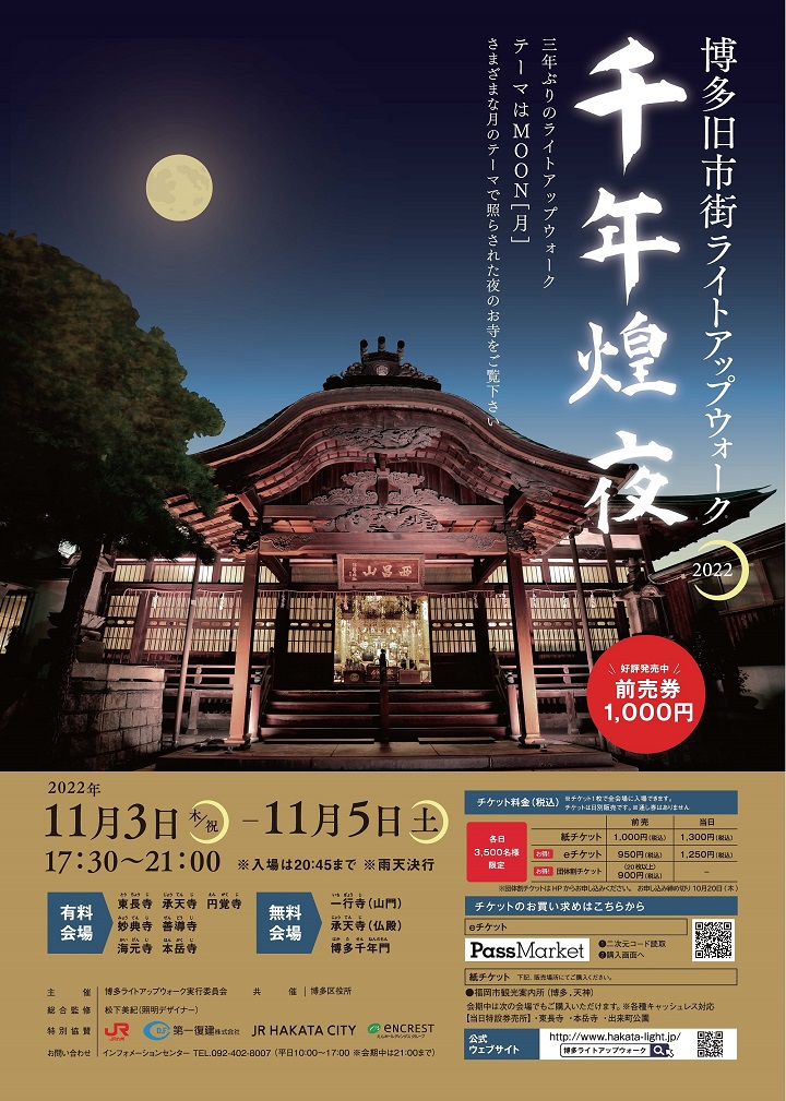 | 開催場所 | 【有料会場】東長寺(福岡大仏夜間特別公開有)、承天寺、円覚寺、妙典寺、善導寺、海元寺、本岳寺 【無料会場】一行寺(山門)・承天寺(仏殿)・博多千年門 |