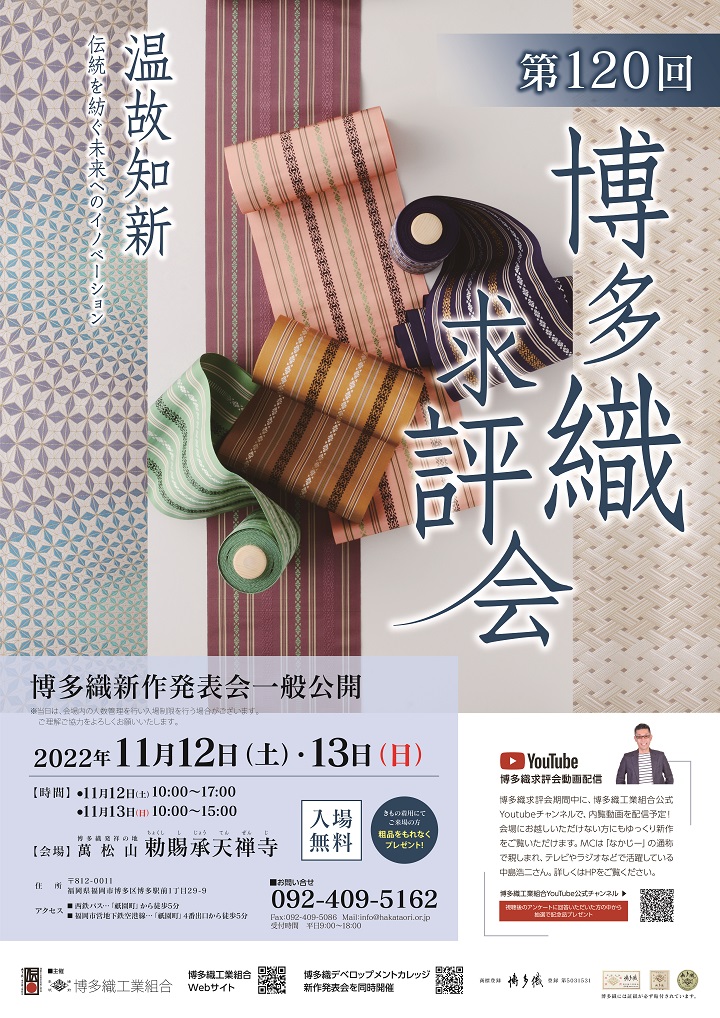博多織業界最大のイベント。120回の今回は、特別企画として、織元やクリエーターが、博多織発祥の地承天禅寺にて博多献上の特別展示を行います。