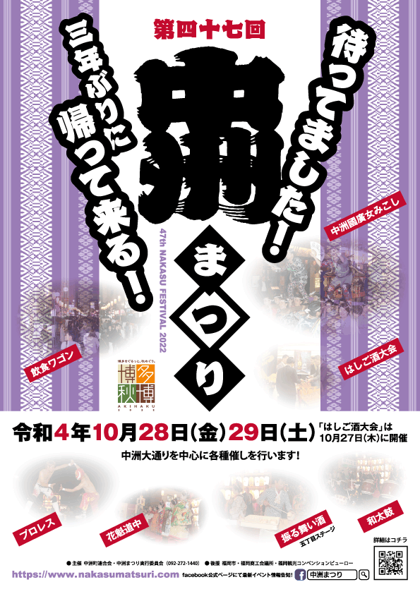 10月27日(木)~10月29日(土)に、中洲一帯で「第47 回中洲まつり」が開催されます。