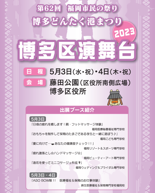 博多区役所・藤田公園(博多区役所南側広場)の博多区演舞台でも様々なパフォーマンスが行われます!さらに専門学校もブースを出展しておりますので、ぜひご参加ください!