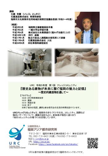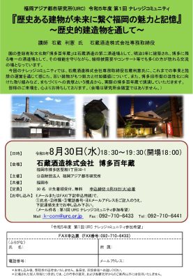 福岡アジア都市研究所主催で、 令和5年度第1回ナレッジコミュニティ『歴史ある建物が未来に繋ぐ福岡の魅力と記憶』~歴史的建造物を通して~ を8月30日(水)18:30~開催します。講師は石蔵酒造(株)石蔵 利憲氏です!