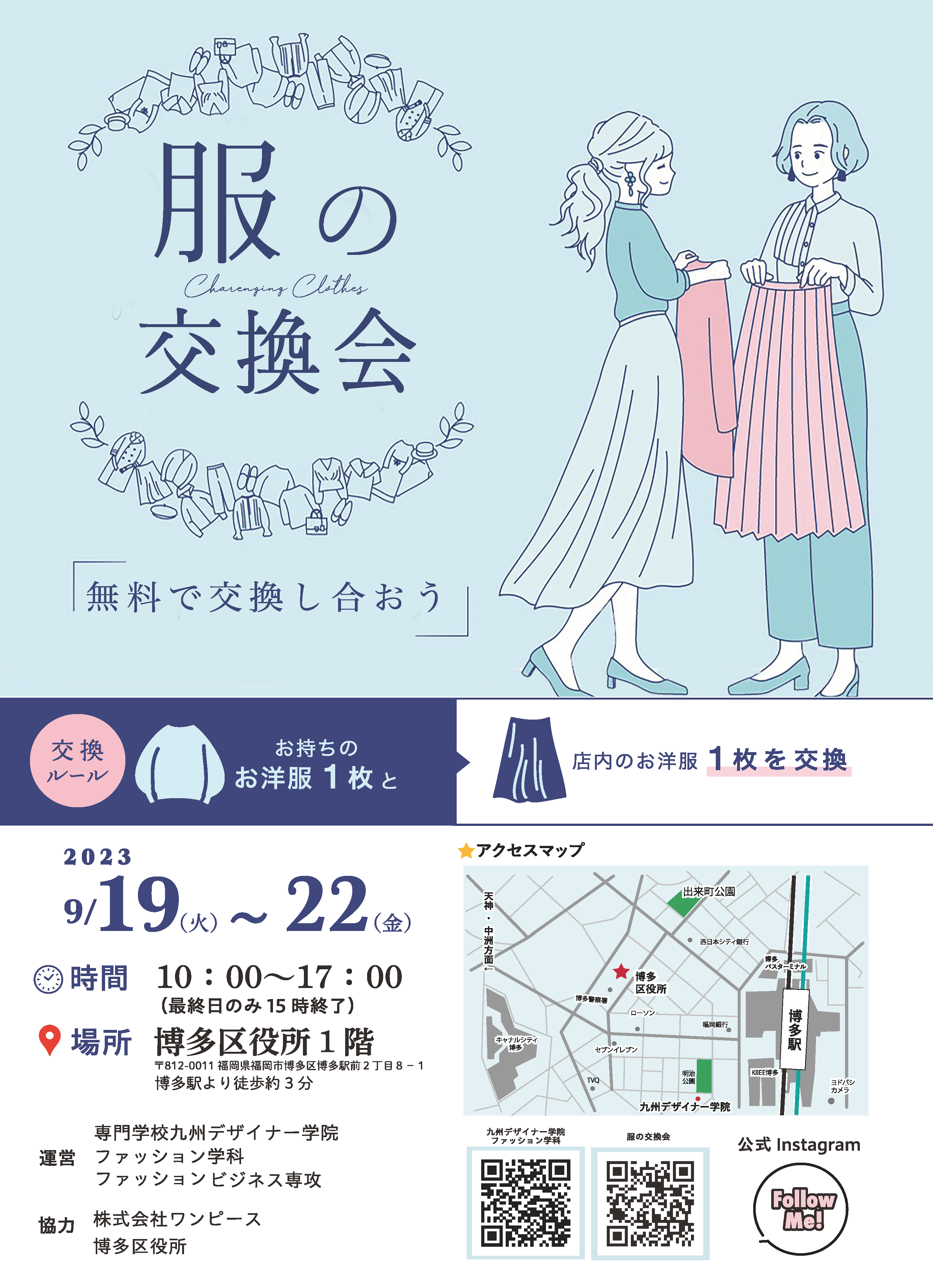 9月19日(火)より9月22日(金)まで博多区役所1F多目的スペースにて「服の交換会」が開催されます。