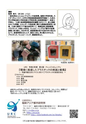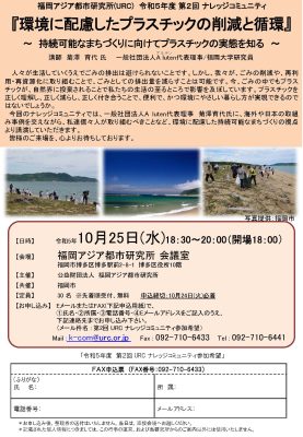 福岡アジア都市研究所主催で、 令和5年度第2回ナレッジコミュニティ『環境に配慮したプラスチックの削減と循環』 ~持続可能なまちづくりに向けてプラスチックの実態を知る~ を10月25日(水)18:30~20:00に開催します。講師は菊澤育代氏です!
