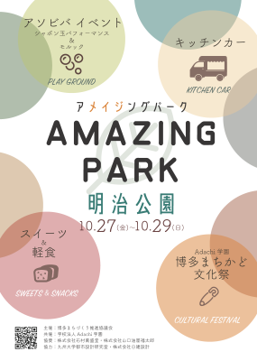 10月27日(金)~10月29日(日)の3日間「アメイジングパーク明治公園~博多まちかど文化祭~」が開催されます! 期間中は学生によるライブペイントやビューティーイベント、スイーツや軽食の販売、シャボン玉体験やモルック体験など盛りだくさんです!
