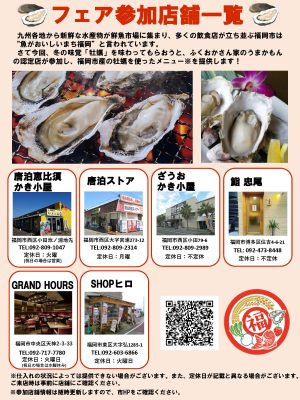 フェア参加店(ふくおかさん家のうまかもん認定店)で、冬の味覚牡蠣を堪能し、福岡の漁業者さんを応援しましょう♪