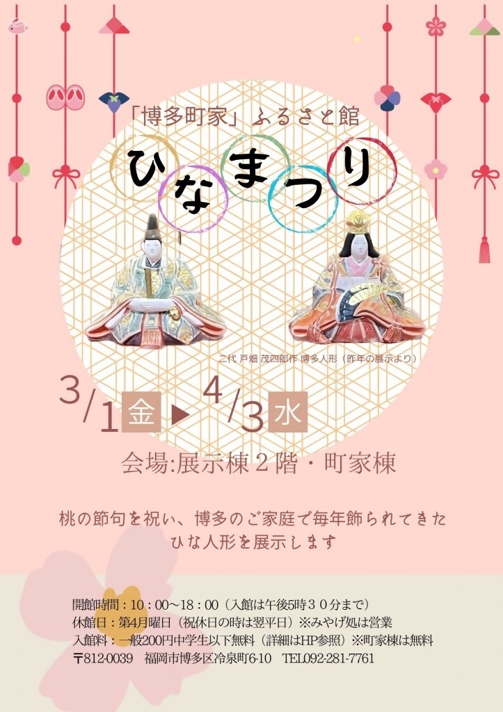 「博多町家」ふるさと館では3月1日(金)より4月3日(水)まで「季節展ひなまつり」が開催されます! 桃の節句を祝い、博多のご家庭で毎年飾られてきたひな人形やひな飾りが展示されますのでぜひ足を運んでみてださい! くわしくはこちらをチェック!
