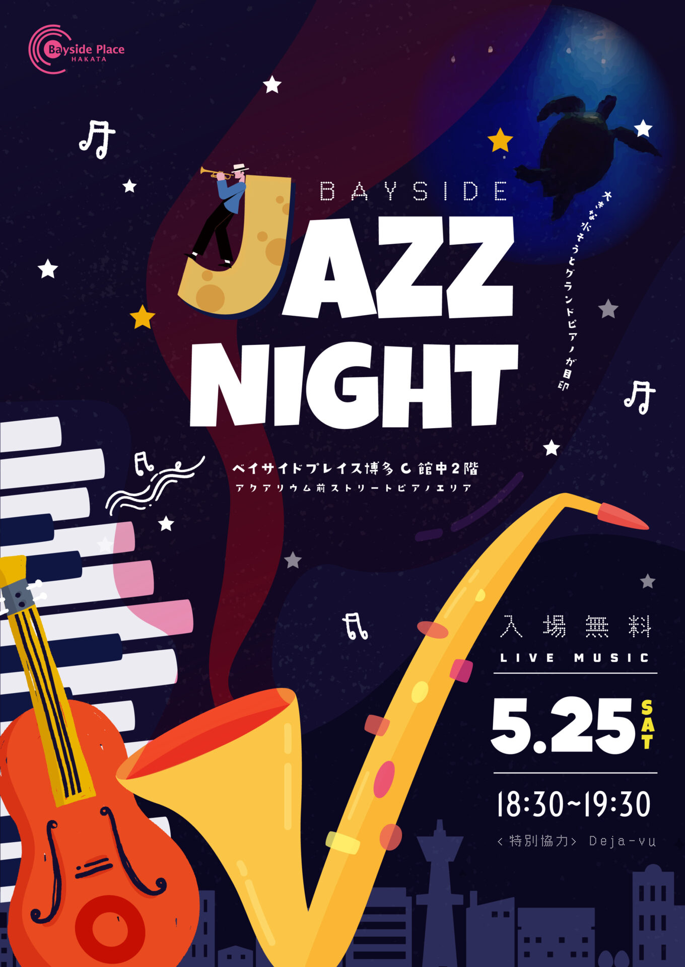 ベイサイドプレイス博多では、5月25日(土)に「BAYSIDE JAZZ NIGHT」が開催されます!アクアリウムと巨大壁画が醸し出す神秘的な空間で、サックス・ピアノ・ギターの奏が生み出すJazzセッションをお楽しみいただけます!