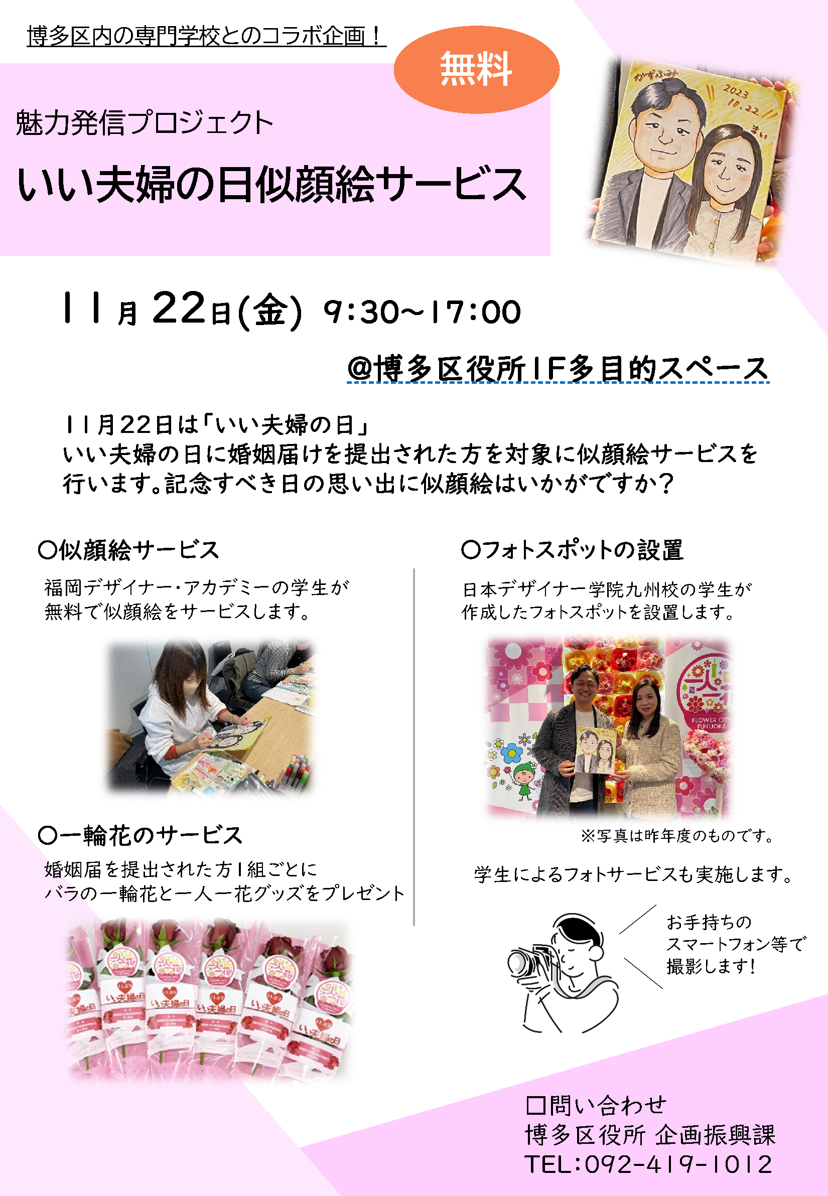 11月22日(金)「いい夫婦の日」に博多区役所1F 多目的スペースにて婚姻届を提出された方を対象に無料で似顔絵サービスを行います!さらにフォトスポットの設置や一輪花のサービスも行います! 記念すべき日の思い出に似顔絵はいかがですか? くわしくはチラシをご確認ください!