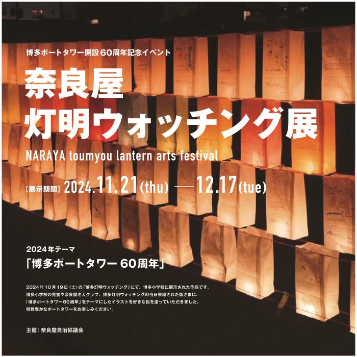博多ポートタワー展望台で、11月21日(木)~12月17日(火)に「奈良屋灯明ウォッチング展」が開催されます😊 10月19日開催された博多灯明ウォッチングで、博多小学校に展示された作品です☆児童・老人クラブなどの皆様に塗っていただいた「博多ポートタワー60周年」がテーマのイラストをお楽しみください♪