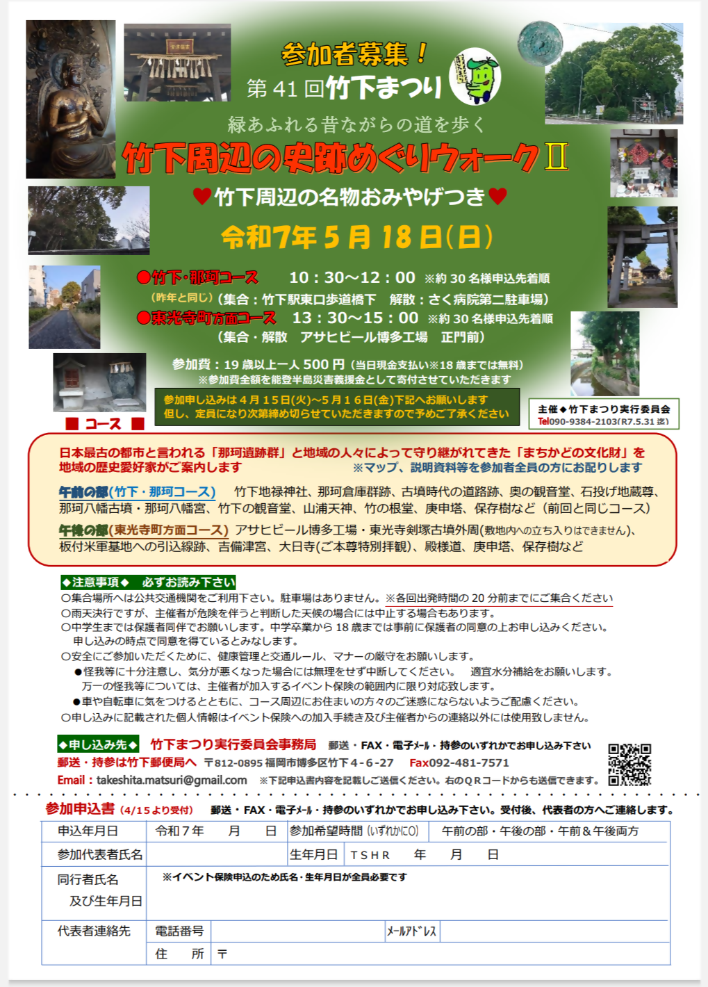 5月18日(日)に竹下周辺の史跡めぐりウォークⅡが開催されます! ⽇本最古と⾔われる「那珂遺跡群」と地域の⼈々によって守り継がれてきた「まちかどの⽂化財」を地域の歴史愛好家がご案内します。祭りの賑わいを遠く聞きながらのどかな史跡めぐりをお楽しみください。くわしくはチラシをご覧ください!
