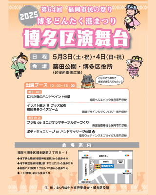 5月3日(土・祝)、4日(日・祝)に第64回博多どんたく港まつりが開催されます✨ 藤田公園(博多区役所南側広場)の博多区演舞台でも様々なパフォーマンスが行われます!さらに専門学校もブースを出展しておりますので、ぜひご参加ください! くわしくはこちらをチェック♪