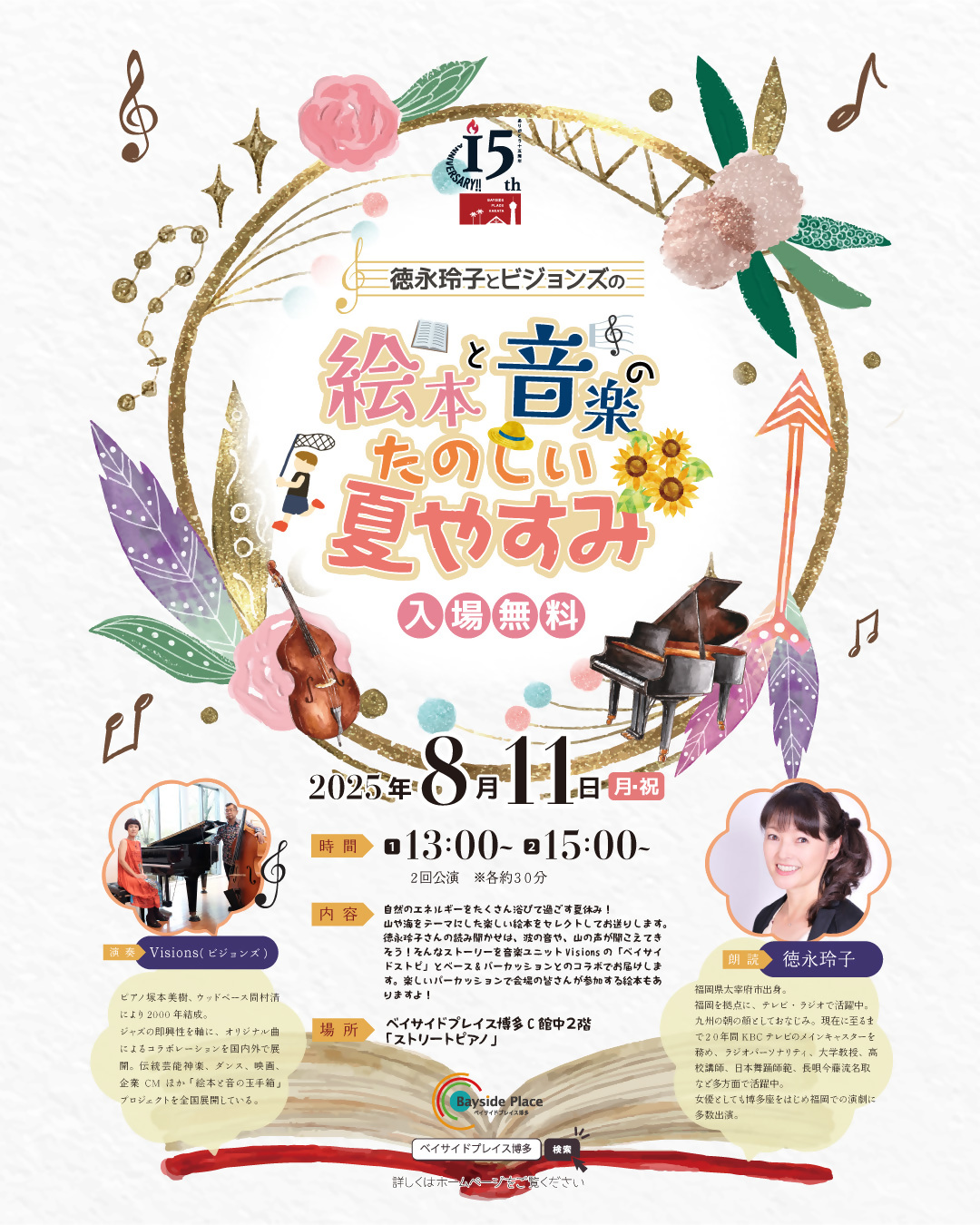 ベイサイドプレイス博多(福岡市博多区築港本町13-6)で 『徳永玲子とビジョンズの「絵本と音楽のたのしい夏休み」 』が開催されます!