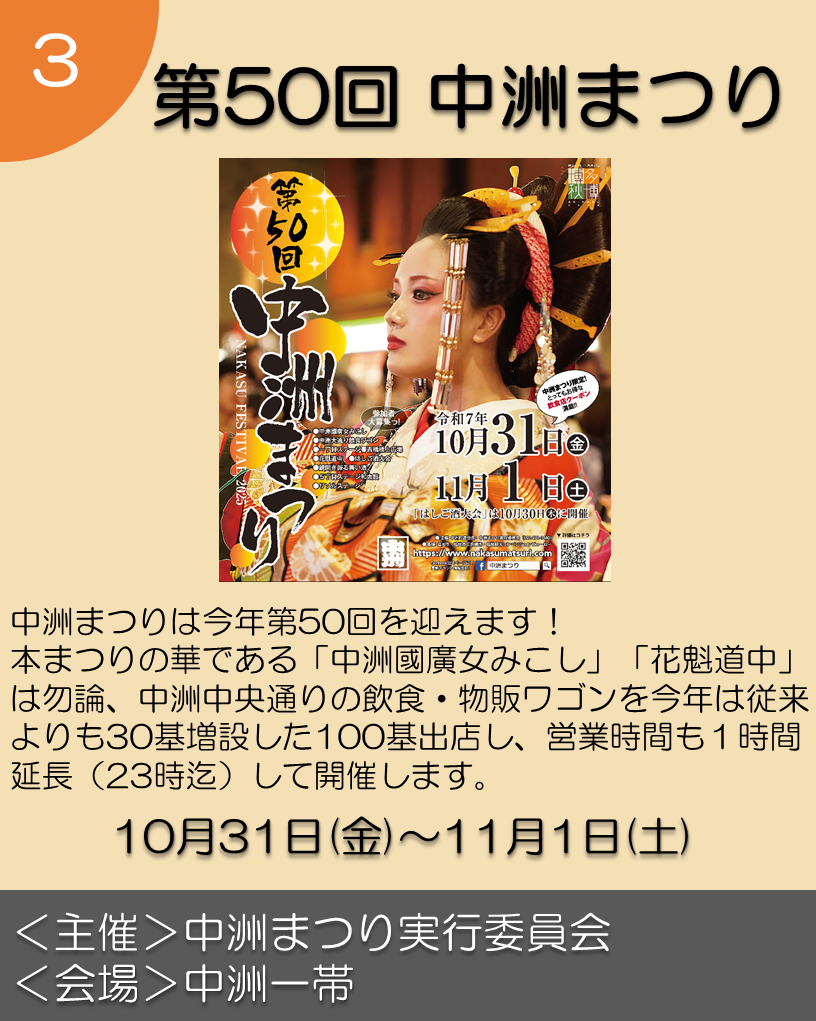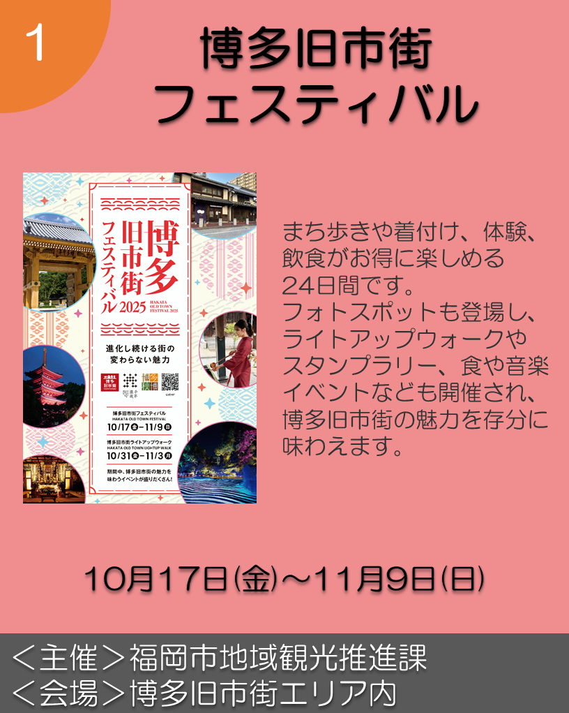 9月から11月にかけて開催される、お祭りやイベントを『博多秋博』として紹介しています!見て、聞いて、参加して、ぜひ秋の博多にお越しください♪