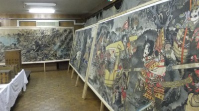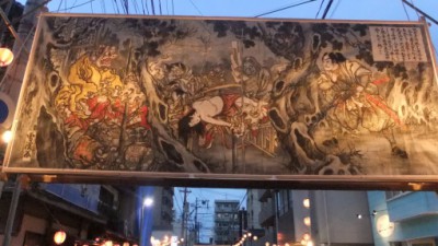 海老崎雪溪作の武者絵は、福岡県有形民俗文化財の指定を受けており、その武者絵大灯篭は「大浜流灌頂」独特の風物詩として親しまれてきました。現在は、往時を偲ぶ名残として、3基が建立され、残りの武者絵は期間中、旧大浜公民館で公開展示されています。