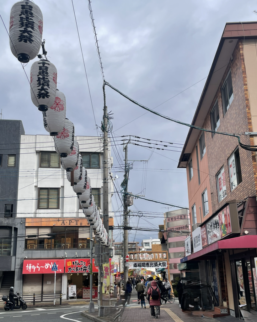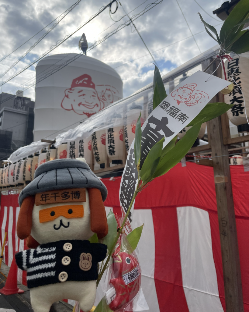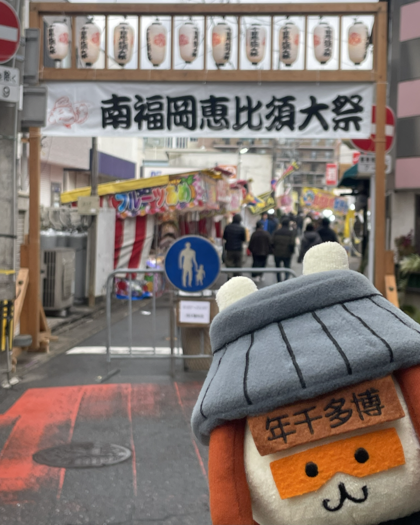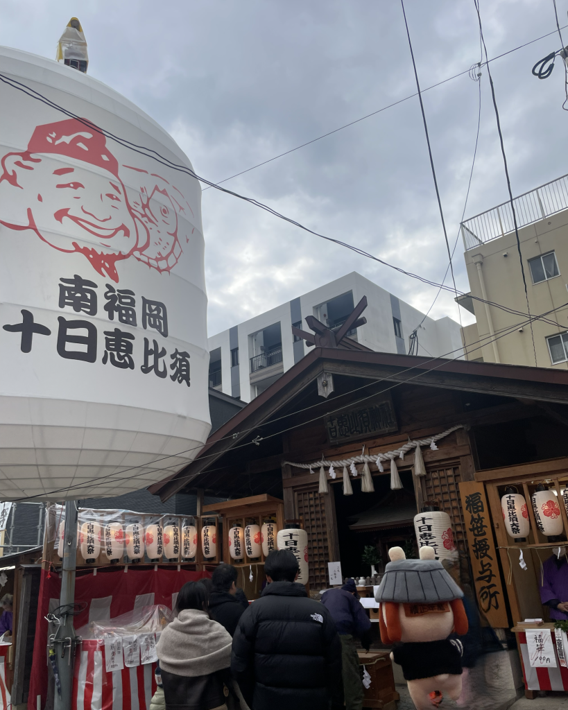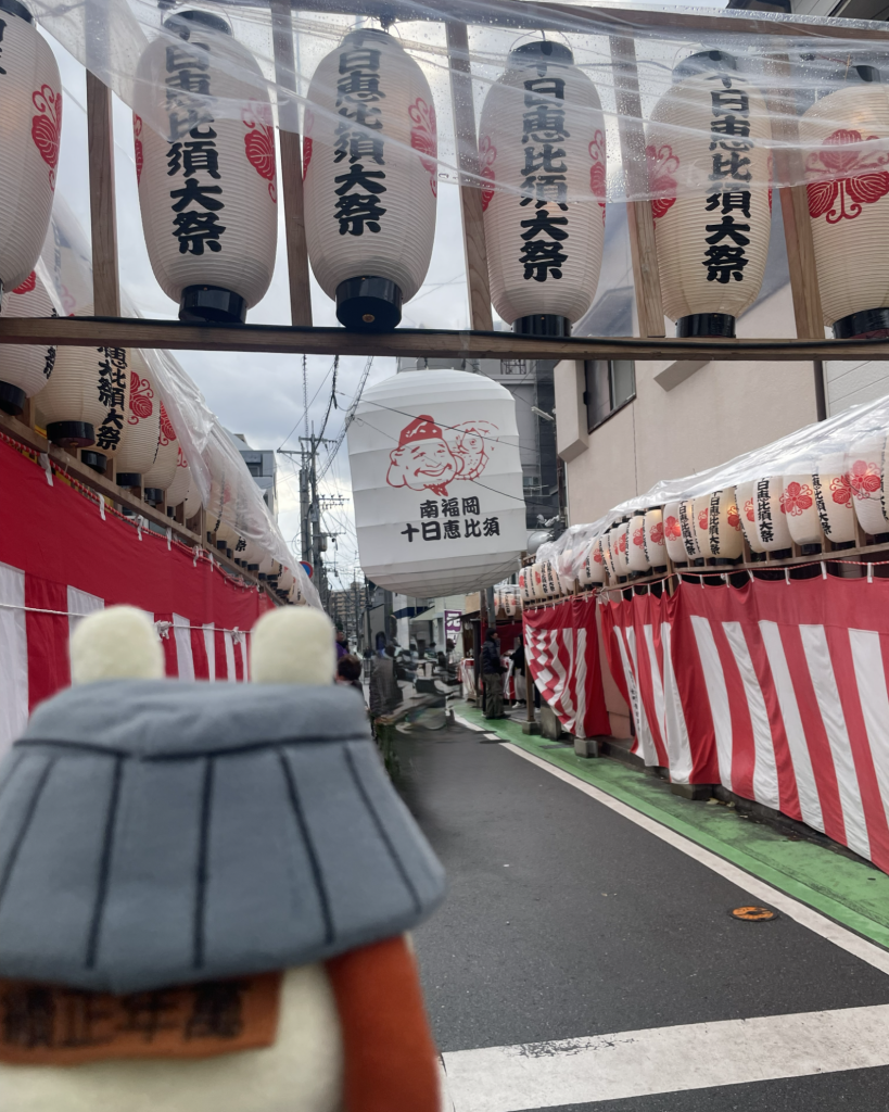 南福岡十日恵比須大祭にいってきたんだもん! JR南福岡駅近くにある南福岡十日恵比須神社で、毎年12月に、商売繁盛を祈願する『南福岡十日恵比須大祭』が行われているんだもん。 あいにくの冷たい曇り空だったけれども、露天も出ていて、お友達が書いた恵比須さまのぬりえも展示されていたんだもん。 お祭りのシンボルの大提灯の大きさにびっくりしたんだもん! せんねもんも神社にお参りをして、福笹と鯛みくじをゲットしたんだもん♪