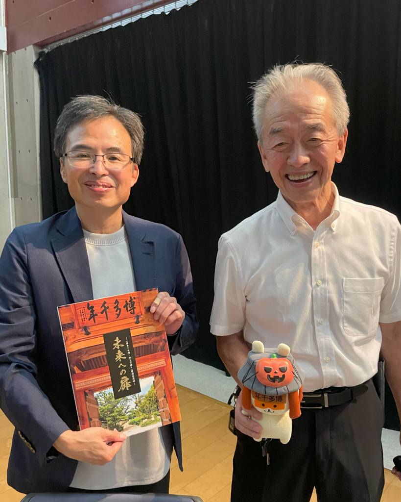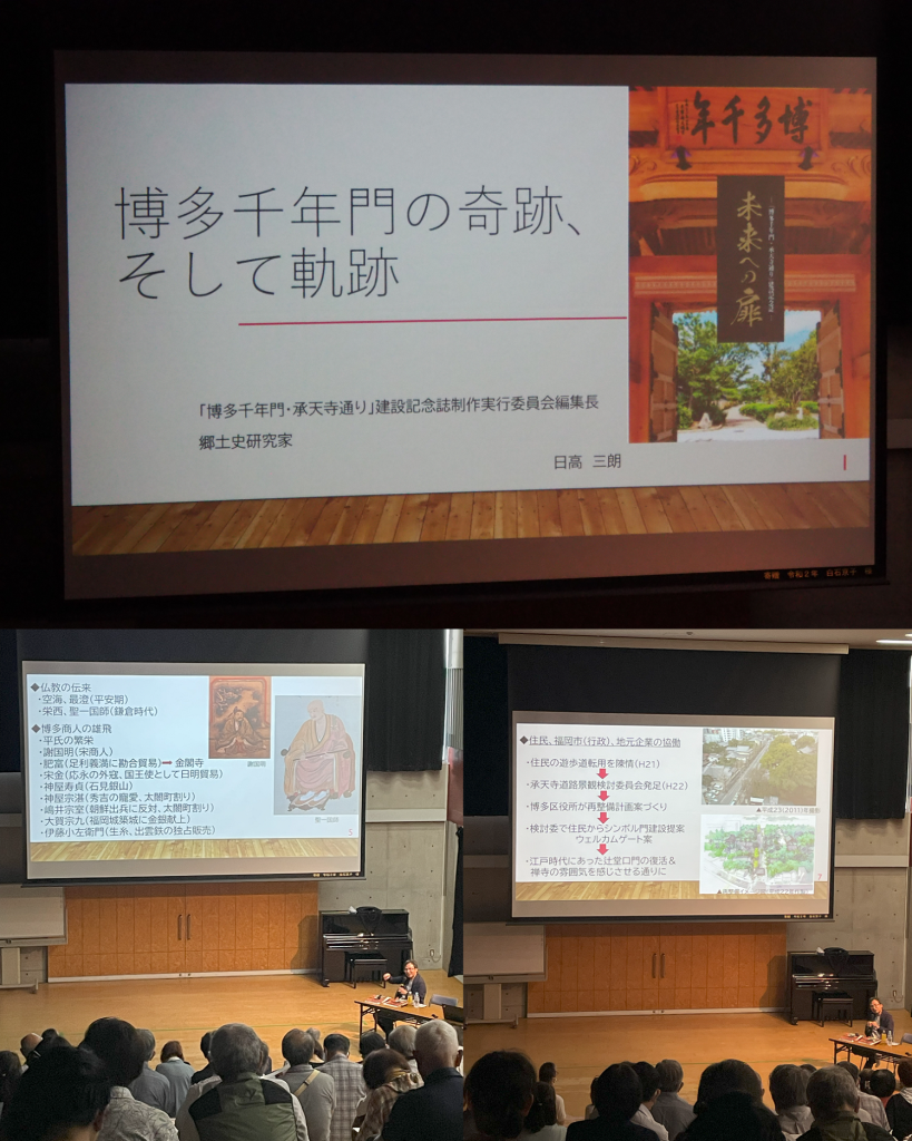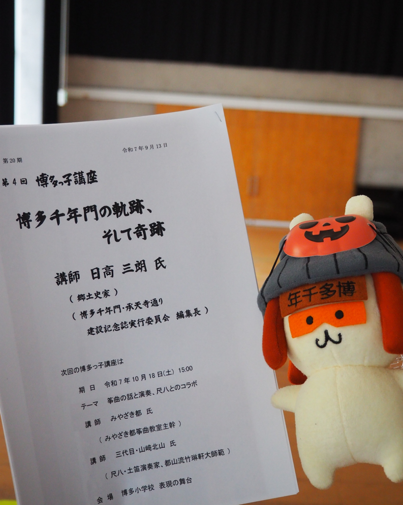 第4回博多っ子講座に行ってきたんだもん! 今回のテーマは、せんねもんのルーツ『博多千年門』! 博多千年門にまつわる歴史や建設の経緯についてお話してくれたんだもん。 講演後には、日高講師と上田議長と記念撮影したんだもん。 博多っ子講座も残すところあと3回!みんなもぜひ参加してほしいんだもん♪