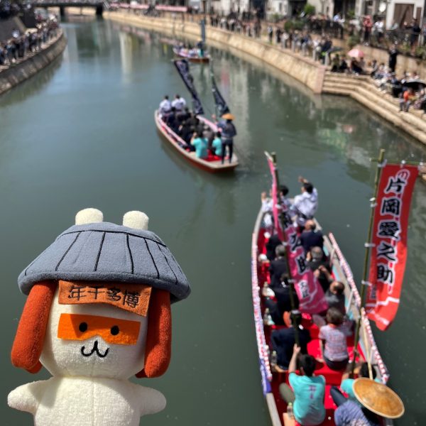 博多の魅力発信キャラクター妖精の“せんねもん”だもん 4年ぶり開催の「船乗り込み」に行ってきたもん♪ 紙吹雪舞う中進む船に、観客からの屋号や拍手で大盛り上がりだったもん!せんねもんも乗れる日がきたら嬉しいもん♪