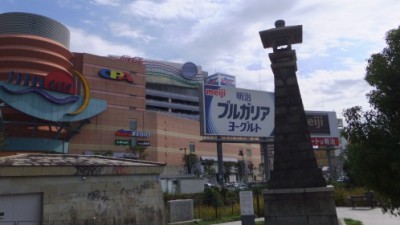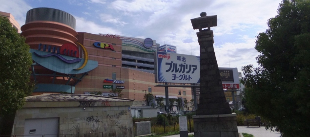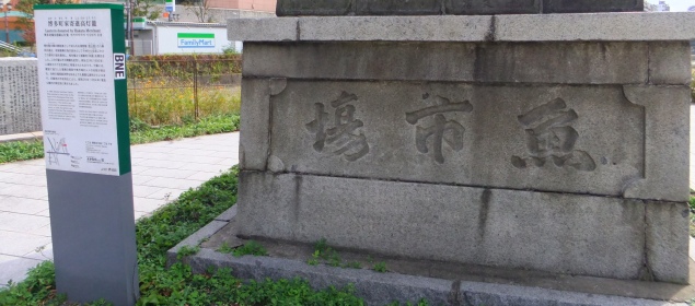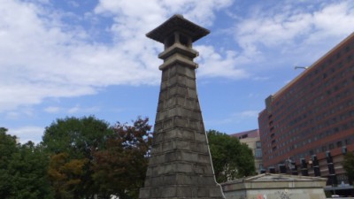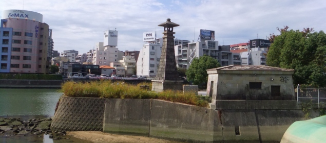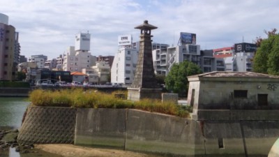 中洲の南端の清流公園に立派な石灯籠が立っています。高さ約10メートルの石灯籠は、明治33年(1900年)に博多の金山堂という漬物商・八尋利兵衛(やひろ りへい)が遊園地「向島」を建設した際に開園を記念して建てたもので、昭和29年に現在の場所に移設されました。