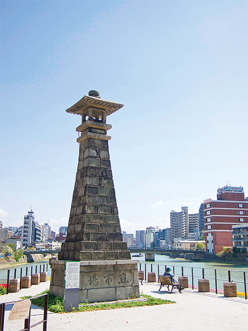 中洲の清流公園に立つ高さ10mの石灯籠。